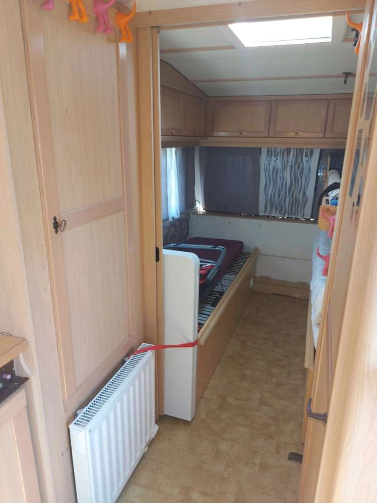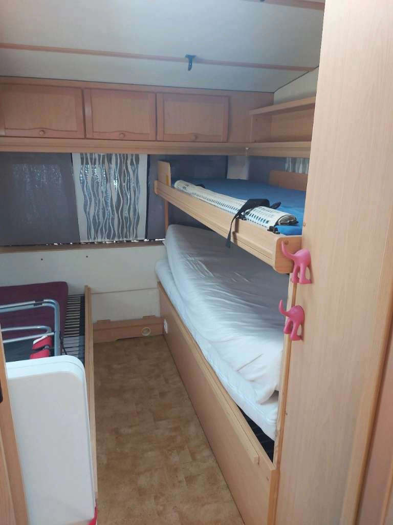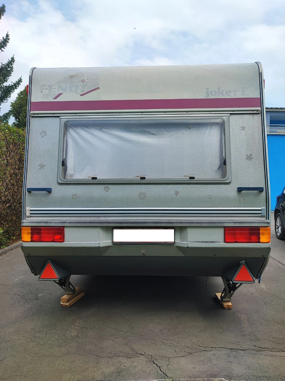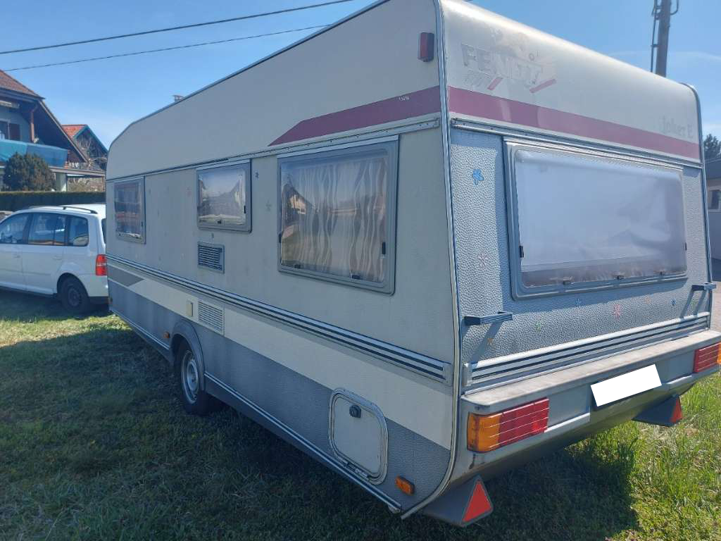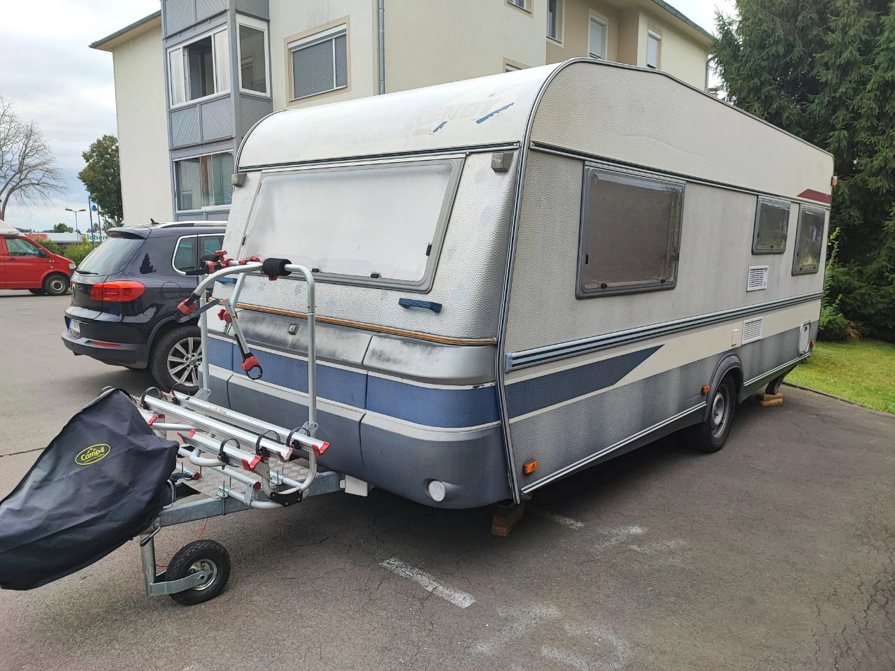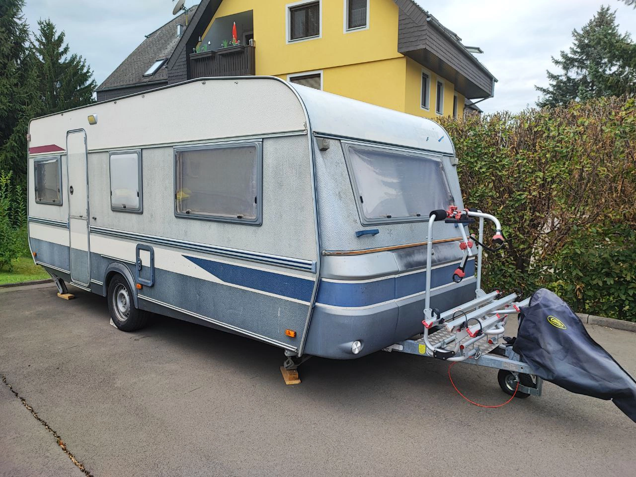 - Ausstattung: Deichsel-Fahrradträger für 3 Fahrräder, Sonnendach (kein vollwertiges Vorzelt), kleines Wintervorzelt, Elektroheizung (kein Gas mehr im Wohnwagen)